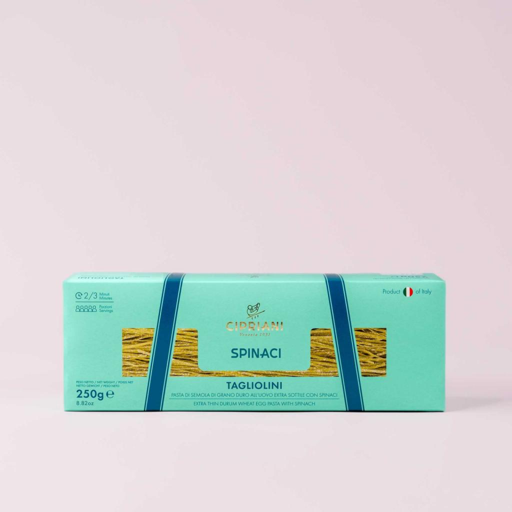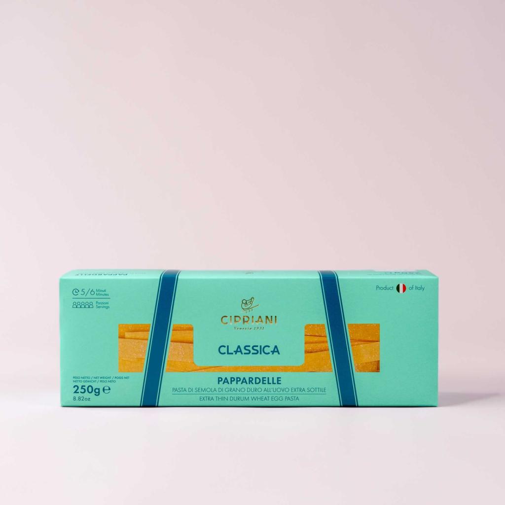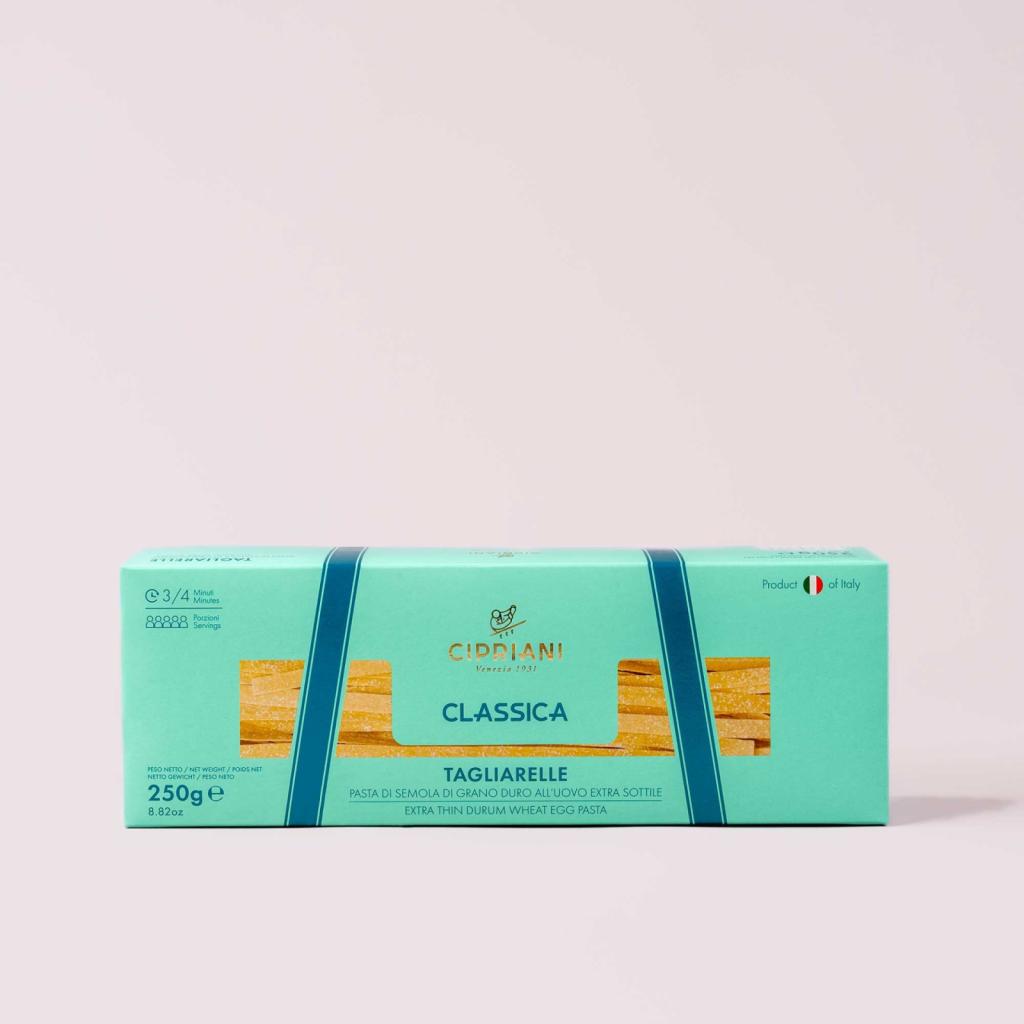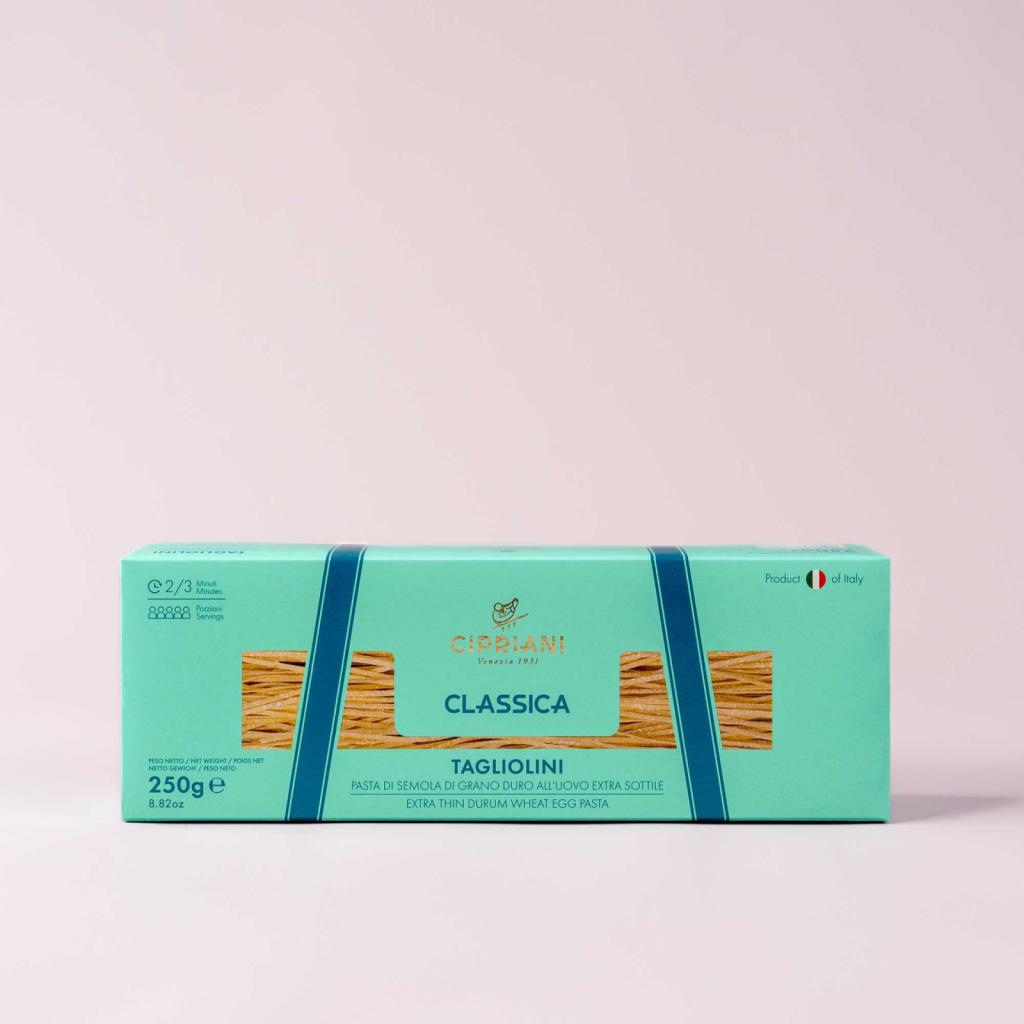 Fabriquées à partir d’ingrédients soigneusement sélectionnés — une semoule de blé dur d’excellence et des œufs frais — les pâtes Cipriani se distinguent par leur finesse exceptionnelle et leur texture soyeuse. Grâce à un procédé artisanal de séchage lent à basse température, elles conservent toute leur saveur naturelle et une tenue impeccable à la cuisson.