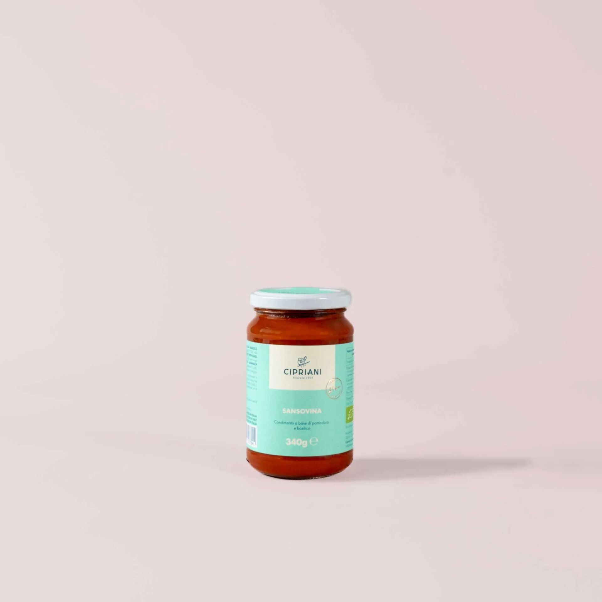 Sansovina, une sauce tomate-basilic bio, onctueuse et parfumée, idéale pour sublimer les pâtes fraîches.
